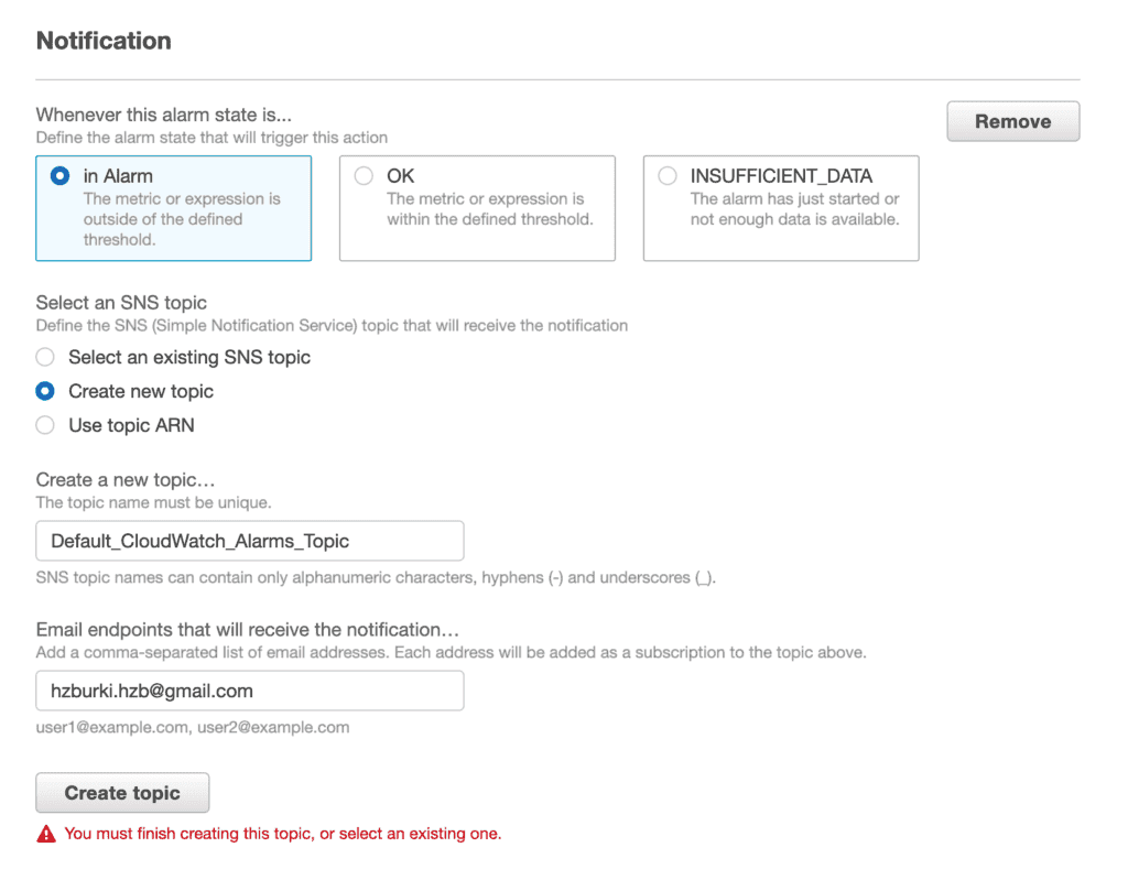 Note: Once the alarm is created, you will need to access your email and confirm the subscription to it.